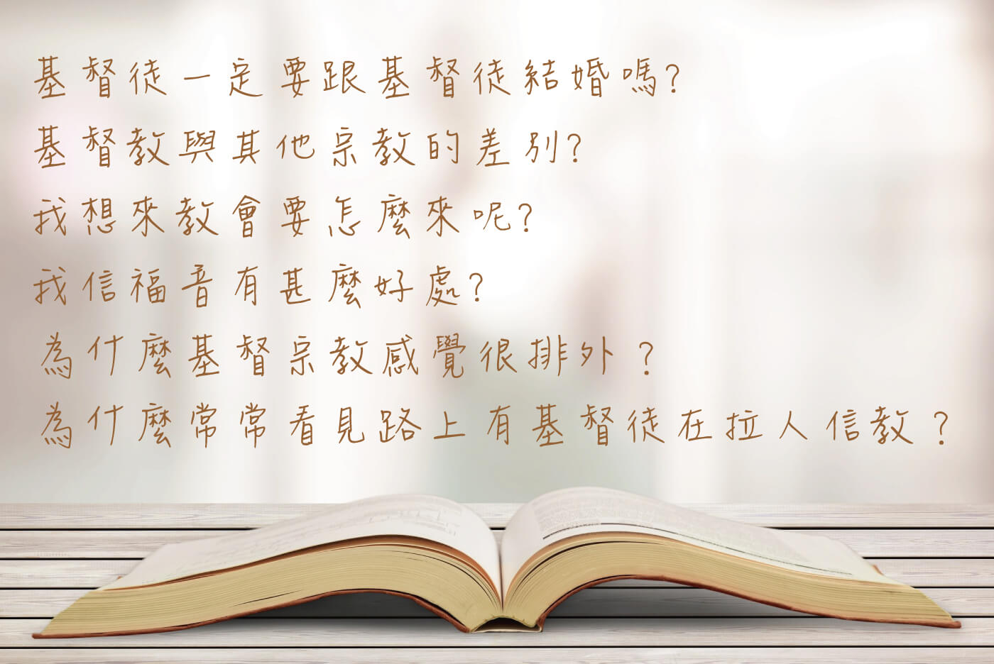 有些人十分不解基督徒路上傳教的行動,甚至感到被打擾。少見其他宗教如此積極。這其實好比如果我們有什麼好康,就想要「報」給親朋好友知道。我們對信仰的態度也是如此。因為這份信仰太過美好,以致我們實在太享分享,即使是陌生人也不放過!下次又遇到向你積極分享的基督徒,不妨停下腳步多聽對方發亮的雙眼之下所述說的話語吧!
